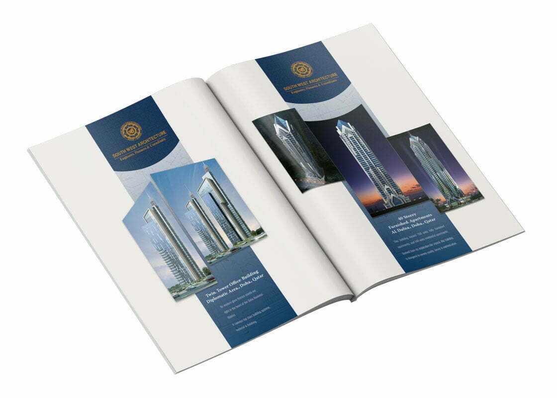South West Architecture (SWA) es una firma de consultoría situada en Qatar que se especializa en planificación, diseño, supervisión y administración de proyectos de ingeniería en una amplia gama de mercados que incluyen: uso comercial y oficinas, residencial, salud y bienestar, educación, hoteles o mezquitas.Durante mi etapa en Santy Comunicación realizo para este cliente un catálogo con sus principales obras hasta la fecha. Se emplea tinta oro, golpe seco, barniz UV e impresión sobre papel cebolla de alto gramaje. A partir del logotipo existente se desarrolla un manual básico corporativo y se definen algunos elementos de la papelería. Además se diseña basándose en la misma gráfica un display publicitario.